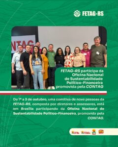 De 1º a 3 de outubro, uma comitiva de nove pessoas da FETAG-RS, composta por diretores e assessores, está em Brasília participando da Oficina Nacional de Sustentabilidade Político-Financeira, promovida pela CONTAG.
