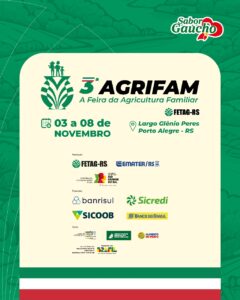De 3 a 8 de novembro, o Largo Glênio Peres, em Porto Alegre, sediará a 3ª edição da AGRIFAM – Feira da Agricultura Familiar, promovida pela Federação dos Trabalhadores na Agricultura do Rio Grande do Sul (FETAG-RS), com realização conjunta da Emater/RS-Ascar e da Secretaria do Desenvolvimento Rural (SDR), apoio do Ministério do Desenvolvimento Agrário e Agricultura Familiar (MDA), da Prefeitura de Porto Alegre, da Universidade Federal da Fronteira Sul (UFFS) e do programa Alimento no Prato, e patrocínio do Banrisul, Sicredi, Sicoob e Banco do Brasil.