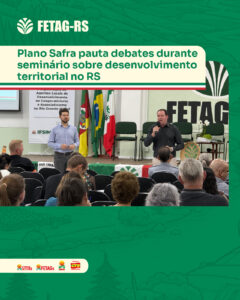 O Plano Safra da agricultura e pecuária familiar esteve no centro dos debates durante a programação da tarde do seminário “Desenvolvimento Territorial: os desafios da agricultura e da pecuária familiar no Rio Grande do Sul”, realizado pela FETAG-RS e pelo IFSIM, nesta terça-feira (31), em Porto Alegre.