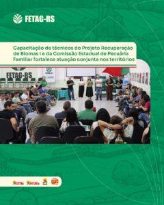 A Fetag-RS realizou, nos dias 7 e 8 de abril, a capacitação de técnicos do Projeto Recuperação de Biomas I e da Comissão Estadual de Pecuária Familiar, em parceria com a Secretaria do Meio Ambiente e Infraestrutura do RS, a Embrapa Pecuária Sul e a RGE. A atividade reuniu técnicos, dirigentes, pesquisadores e parceiros com o objetivo de alinhar estratégias, fortalecer a atuação nos territórios e qualificar a execução das ações junto às Unidades de Aprendizagem e Capacitação (UACs), metodologia desenvolvida pela Embrapa.